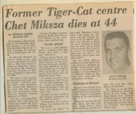 Chet Miksza was a centre for the Hamilton Tiger-Cats of the Canadian Football League from 1952-1968.