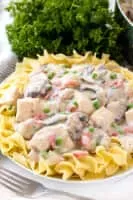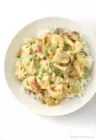 Chicken à la King is a dish consisting of diced chicken in a cream sauce, and often with sherry, mushrooms, and vegetables, served over rice, noodles, or bread.