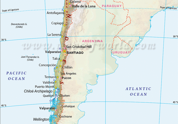 Chile is a long, narrow country stretching along South America's western edge, with more than 6,000km of Pacific Ocean coastline. Santiago, its capital, sits in a valley surrounded by the Andes and Chilean Coast Range mountains. The city's palm-lined Plaza de Armas contains the neoclassical cathedral and the National History Museum. The massive Parque Metropolitano offers swimming pools, a botanical garden and zoo. ― Google