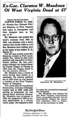Clarence Watson Meadows was the 22nd Governor of West Virginia from 1945 to 1949. He was the first governor of West Virginia to be born in the 20th century. Meadows was born and raised in Beckley.