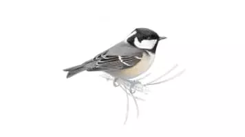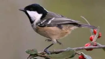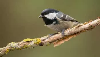 Coal tits have a black cap and throat and white cheeks. They can often be found in parks, gardens and woodland, where a slim bill allows them to feed from conifers better than blue or great tits.