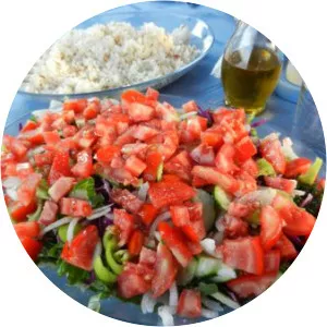 Çoban Salatası or Choban salad, is a salad originated from Turkish cuisine and Azerbaijani cuisine consisting of finely chopped tomatoes, cucumbers, long green peppers, onion, and flat-leaf parsley. The dressing consists of lemon juice, olive oil, and salt.