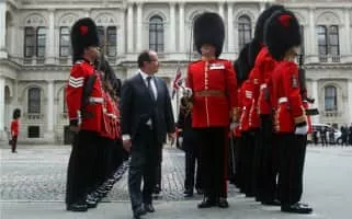 ... At the Clarence House, the home of the Duke and the Duchess of Cornwall, Mr Macron welcomed with a ceremonial guard of honour by the Coldstream Guards, along with music by the Band of the Coldstream Guards...