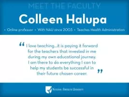 Colleen Halupa is the Dean of Online Education and a professor of Clinical Laboratory Science and Health and Education Administration. She has an A.S. in medical laboratory technology, a B.S. in healthcare management, an M.S. in health administration, and an Ed.