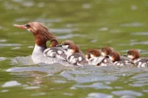The common merganser or goosander is a large duck of rivers and lakes in forested areas of Europe, northern and central Asia, and North America. The common merganser eats fish and nests in holes in trees.