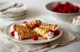 A cream horn is a pastry made with flaky or puff pastry, and whipped cream. The horn shape is made by winding overlapping pastry strips around a conical mould. After baking, a spoonful of jam or fruit is added and the pastry is then filled with whipped cream.