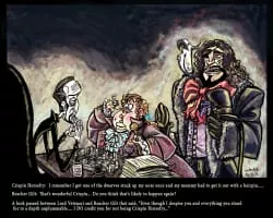 Crispin Horsefry of Ankh-Morpork Mercintile Bank was a vile young man with huge appetites who was bought into Reacher Gilt's scheme to defraud the Dearheart family, the rightful owners of the Grand Trunk in the novel Going Postal. The sight of him eating pot-au-feu was an "unforgettable one" according to Lord Vetinari.