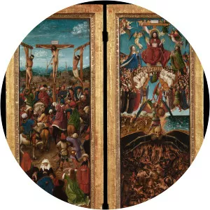 The Crucifixion and Last Judgement diptych consists of two small painted panels attributed to the Early Netherlandish artist Jan van Eyck, with areas finished by unidentified followers or members of his workshop.