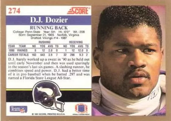 William Henry "D.J." Dozier, Jr. is an American former National Football League running back and Major League Baseball outfielder. He played five seasons with the NFL's Minnesota Vikings and Detroit Lions from 1987 to 1991, and played one season with the MLB's New York Mets in 1992.