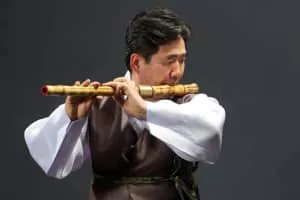 The daegeum is a large bamboo transverse flute used in traditional Korean music. It has a buzzing membrane that gives it a special timbre. It is used in court, aristocratic, and folk music, as well as in contemporary classical music, popular music, and film scores.