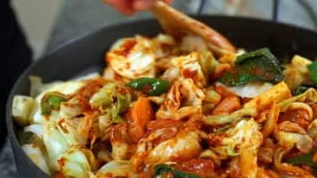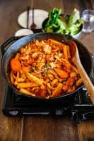 Dak-galbi, or spicy stir-fried chicken, is a popular Korean dish made by stir-frying marinated diced chicken in a gochujang-based sauce with sweet potatoes, cabbage, perilla leaves, scallions, tteok, and other ingredients. In korean, galbi means rib. But Dak-galbi is not actually chicken's rib.