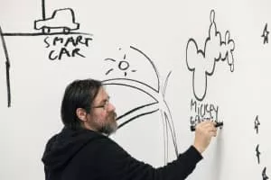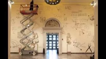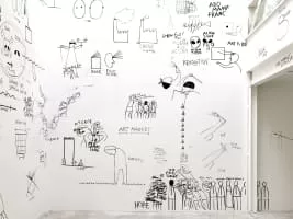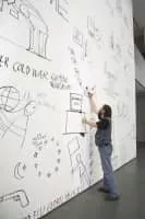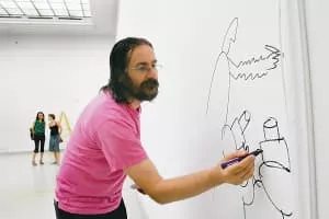 Dan Perjovschi is an artist, writer and cartoonist born on 29 October 1961 in Sibiu, Romania. Perjovschi has over the past decade created drawings in museum spaces, most recently in the Museum of Modern Art in New York City in which he created the drawing during business hours for patrons to see.
