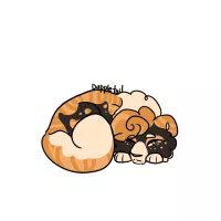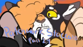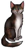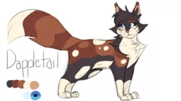 Dappletail is a broad-shouldered, dappled tortoiseshell-and-white she-cat with white patches, a patchy, thick, shiny pelt, amber eyes, and a muzzle gray with age.