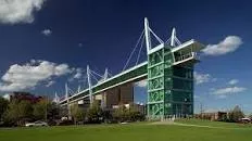 The Davenport Skybridge is a pedestrian cable-stayed bridge that spans River Drive in downtown Davenport, Iowa. It connects LeClaire Park to a courtyard and parking ramp on 2nd Street, located near the River Music Experience. The bridge, completed in 2005, is 50 feet tall, 575 feet long, and features 99 feet columns.
