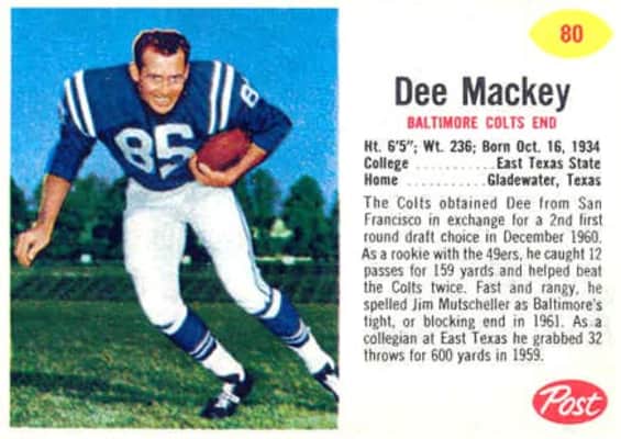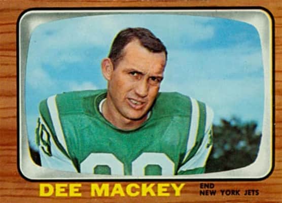 Dee Elbert Mackey was an American football tight end who played professionally for six seasons in the National Football League and the American Football League. He played for the NFL's San Francisco 49ers and the Baltimore Colts. He played for the AFL's New York Jets.