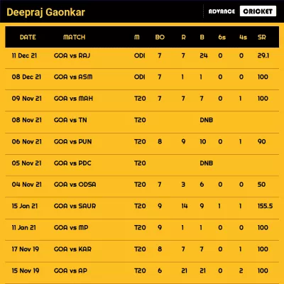 Deepraj Gaonkar is an Indian cricketer. He made his first-class debut for Goa in the 2014–15 Ranji Trophy on 28 December 2014. He made his List A debut for Goa in 2018-19 Vijay Hazare Trophy on 19 September 2018.