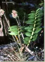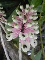 Dendrobium smillieae, commonly known as the bottlebrush orchid, is an epiphytic or lithophytic orchid with large, spongy pseudobulbs, thin, bright green leaves which are shed after their first year and crowded flowers in a bottlebrush-like arrangement.