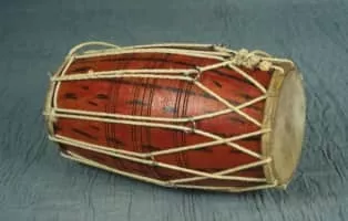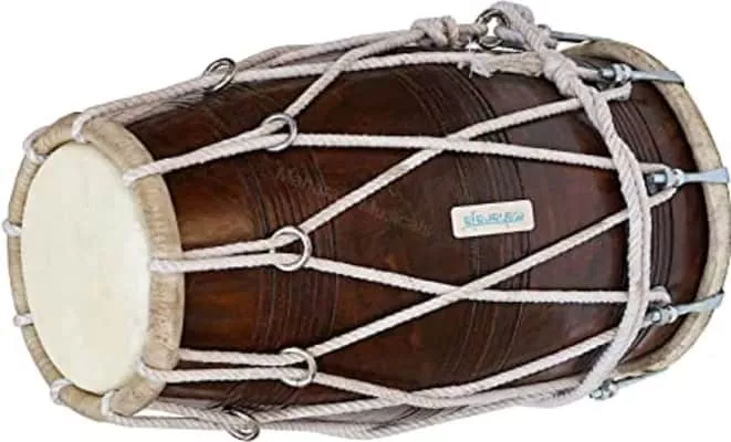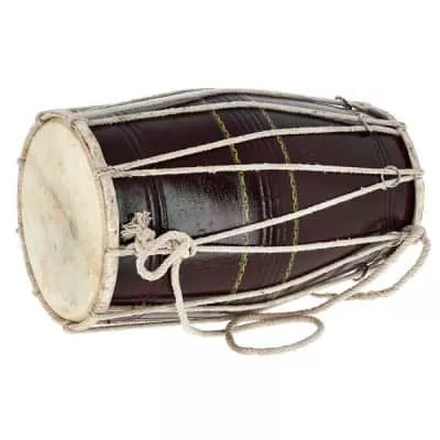 The dholak is a two-headed hand drum, a folk percussion instrument. The instrument is about 45 cm in length and 27 cm in breadth and is widely used in qawwali, kirtan, lavani and bhangra. The drum has two different sized drumheads.