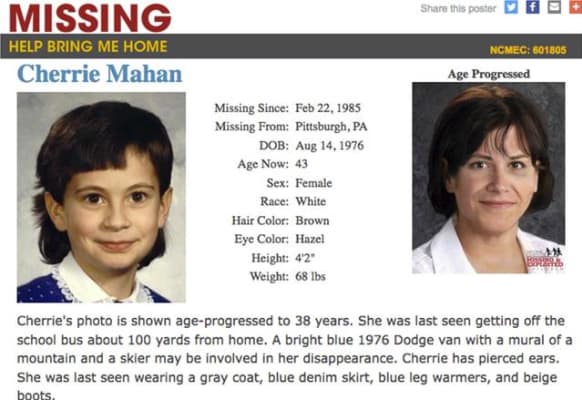 Cherrie Ann Mahan was an eight-year-old American girl who disappeared on February 22, 1985, after disembarking a school bus approximately fifty feet from the base of the driveway to her home in rural Winfield Township, Butler County, Pennsylvania. She was declared legally dead in November 1998.