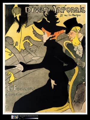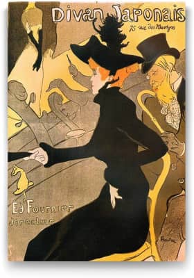 Divan Japonais is a lithograph poster by French artist Henri de Toulouse-Lautrec. It was created to advertise a café-chantant that was at the time known as Divan Japonais. The poster depicts three persons from the Montmartre of Toulouse-Lautrec's time. Dancer Jane Avril is in the audience.