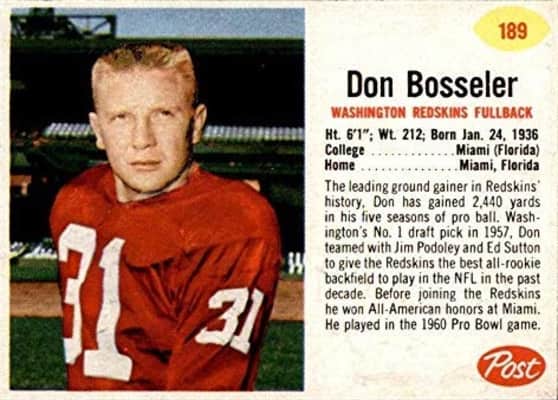 Donald John Bosseler is an American former professional football player who was a fullback in the National Football League for the Washington Redskins from 1957 to 1964. He played college football for the Miami Hurricanes and was selected in the first round of the 1957 NFL Draft with the ninth overall pick.