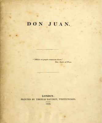In English literature, Don Juan, written from 1819 to 1824 by the English poet Lord Byron, is a satirical, epic poem which portrays the Spanish folk legend of Don Juan, not as a womaniser as the character is historically portrayed, but as a victim easily seduced by women.