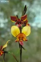 Diuris, commonly known as donkey orchids, bee orchids, nanny goat orchids or pansy orchids, is a genus of more than sixty species of flowering plants in the orchid family, Orchidaceae and is endemic to Australia, apart from one species endemic to Timor.