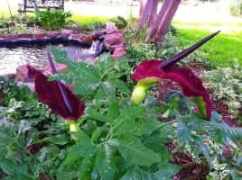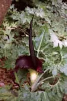 Dracunculus is a genus of two species of a tuberous perennial of the family Araceae. They are characterised by a large purple spathe and spadix, often produced in advance of the pedate, dark green leaves often with white mottling. The open spathe is usually accompanied by a foul smell.