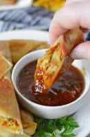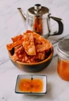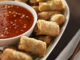 Duck sauce is a condiment with a sweet and sour flavor and a translucent orange appearance similar to a thin jelly. Offered at Chinese-American restaurants, it is used as a dip for deep-fried dishes such as wonton strips, spring rolls, egg rolls, duck, chicken, fish, or with rice or noodles.