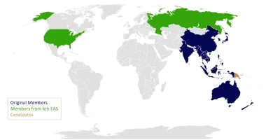 The East Asia Summit is a regional forum held annually by leaders of, initially, 16 countries in the East Asian, Southeast Asian, and South Asian regions, based on the ASEAN Plus Six mechanism. Membership expanded to 18 countries including Russia and the United States at the Sixth EAS in 2011.