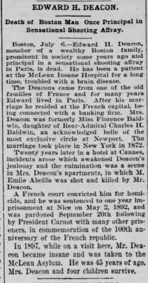 Edward Parker Deacon was an American heir known for killing his wife's lover in her apartments at Cannes, France.