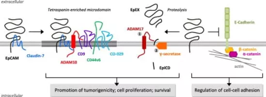 Epithelial cell adhesion molecule is a transmembrane glycoprotein mediating Ca²⁺-independent homotypic cell–cell adhesion in epithelia. EpCAM is also involved in cell signaling, migration, proliferation, and differentiation.