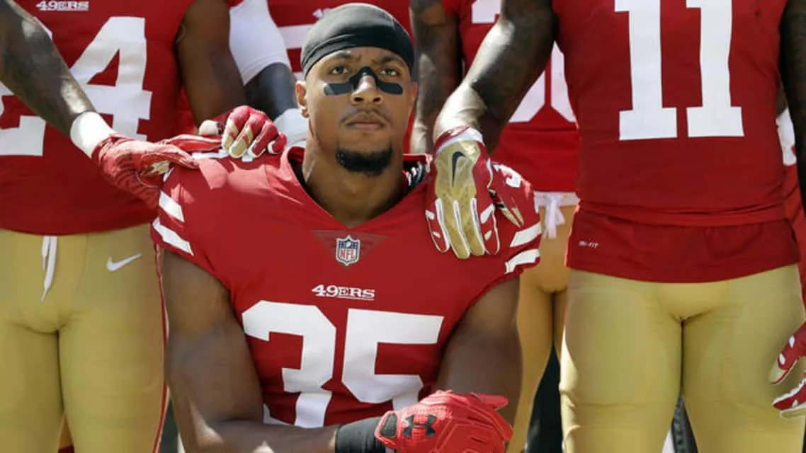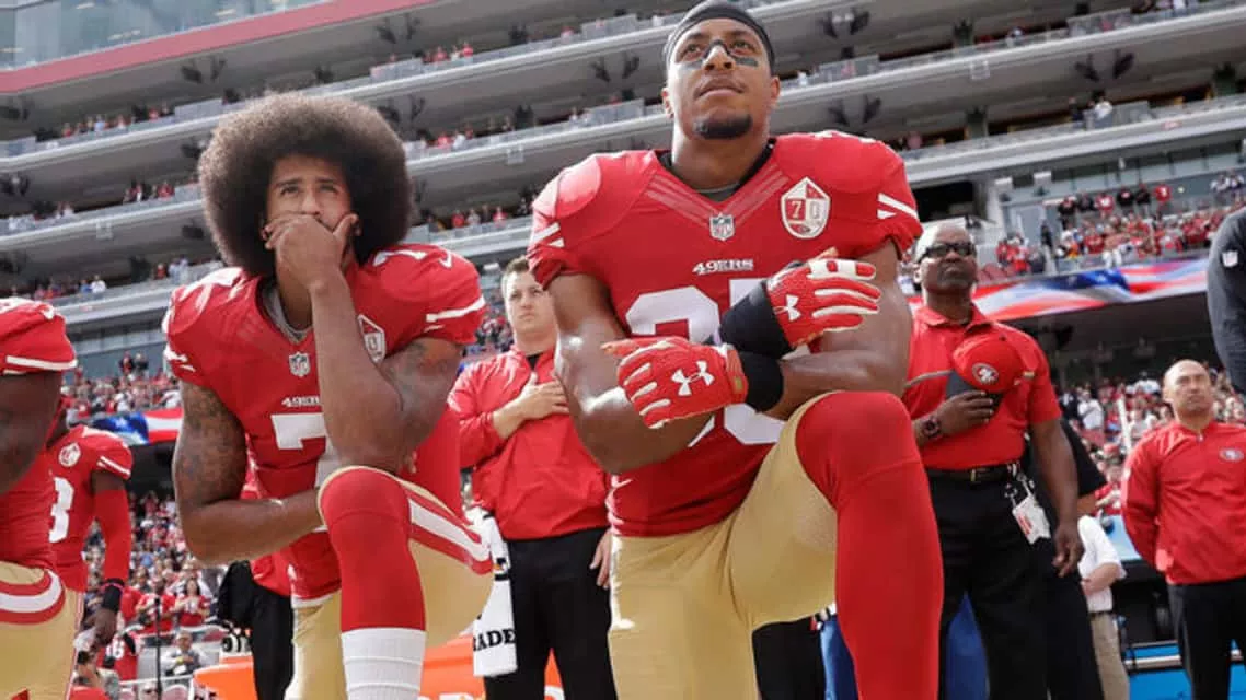 ... Eli Harold, Colin Kaepernick and Eric Reid kneel during the American national anthem before a San Francisco 49ers v New York Jets game in December 2016 Radio 1 Newsbeat wanted to find out what effect, if any, the protests have had on aspiring NFL players...