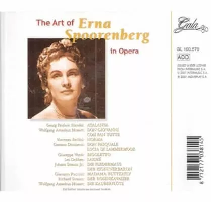 Erna Spoorenberg, Huberdina Aletta Spoorenberg as real name, was a Dutch soprano. She was born in Yogyakarta, Java, Dutch East Indies. As a child, she studied the violin and singing. At the age of 14, she studied under Isa Neuhaus, a singer with the Düsseldorf Opera.