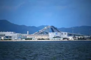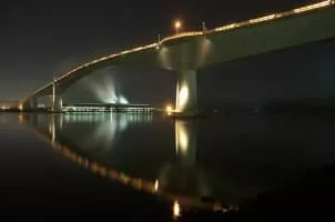 Eshima Ohashi Bridge is a rigid-frame bridge in Japan that connects Matsue, Shimane Prefecture and Sakaiminato, Tottori Prefecture over Nakaumi lake. It was built from 1997 to 2004. It is the largest rigid-frame bridge in Japan and the third largest in the world.