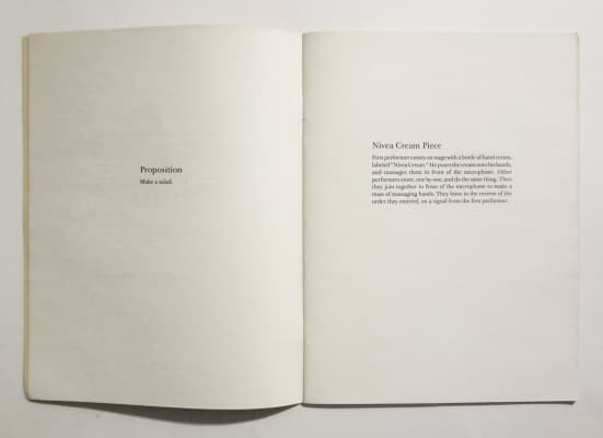 "Event Scores, involve simple actions, ideas, and objects from everyday life recontexualized as performance. Event Scores are texts that can be seen as proposal pieces or instructions for actions. The idea of the score suggests musicality. ...