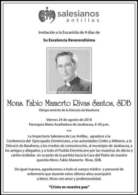 Fabio Mamerto Rivas Santos was a Dominican Roman Catholic prelate. Born in Cabirmota, La Vega, Rivas Santos was ordained to the priesthood in 1965. He served as the Bishop of Barahona from 1976 until his resignation in 1999. He died on 11 August 2018 in Jarabacoa, at the age of 86.
