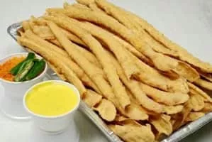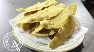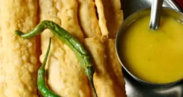 Fafda is a popular Gujarati snack. In many festivals, fafda is the most preferred snack. Fafda is rectangular in shape and yellowish in complexion. It is eaten with a chutney and salty fried-green chilis.