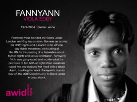 FannyAnn Viola Eddy was an activist for lesbian and gay rights in her native Sierra Leone and throughout Africa. In 2002, she founded the Sierra Leone Lesbian and Gay Association, the first of its kind in Sierra Leone. She traveled widely, addressing the United Nations and other international groups.