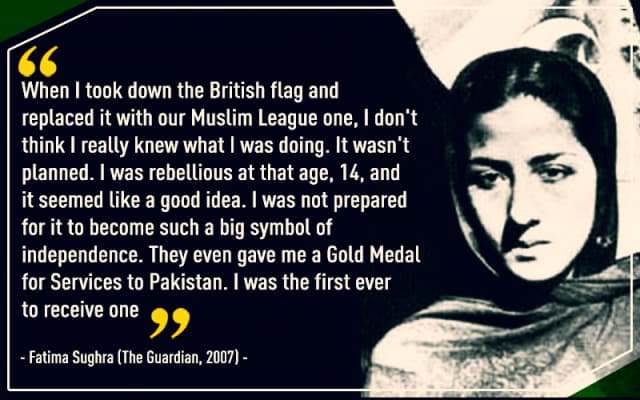 Fatima Sughra Begum, garnered fame as a teenager, when at age 14 in 1947, she ripped down the Union Jack from the Lahore Civil Secretariat and replaced it with the All-India Muslim League flag.