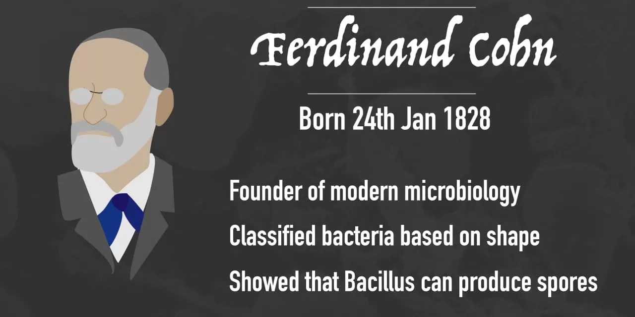 Ferdinand Julius Cohn was a German biologist. He is one of the founders of modern bacteriology and microbiology. Ferdinand J. Cohn was born in the Jewish quarter of Breslau in the Prussian Province of Silesia. His father, Issak Cohn, was a successful merchant and manufacturer.
