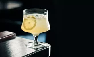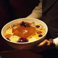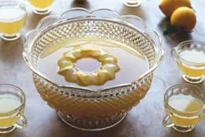 Fish House Punch is a strong, rum-based punch containing rum, cognac, and peach brandy. The drink is typically served over an ice block in a punch bowl and garnished with lemon slices.