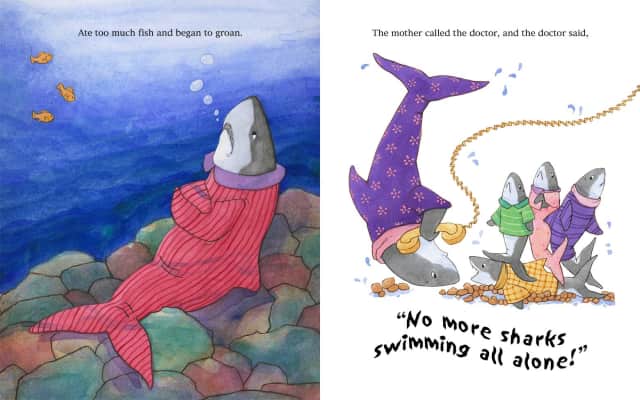 When the doctor gets frustrated by the riotous play of the five little sharks, he decides to send them packing, yet after he does so, the neighborhood becomes all too quiet as the big blue ocean simply appears all too empty without them.