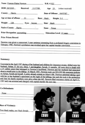 Frances Elaine McLemore Newton was executed by lethal injection in the state of Texas for the April 7, 1987 murder of her husband, Adrian, 23, her son, Alton, 7, and daughter, Farrah, 21 months.