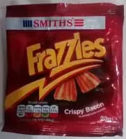 Frazzles are a bacon-flavour corn-based snack sold in the United Kingdom, once manufactured by Smiths, now by Walkers. The packet has kept to the same crimson background with yellow writing style throughout the brand's presence in the market. The snacks have been produced since 1975, as printed on recent packaging.