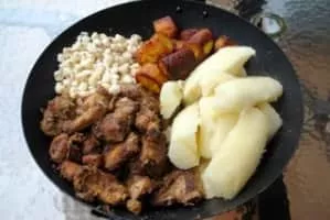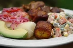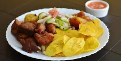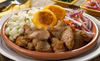 Fritada is a typical dish in Ecuadorian cuisine. Its main ingredient is fried pork. It is a traditional dish, and its origins date back to the colonial era, to the beginning of the 19th century. The pork is cooked in boiling water with various spices and then is fried with pork fat in a brass pan over flames.