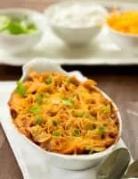 Frito pie is a dish popular in the Southern, Midwestern, and Southwestern United States, whose basic ingredients are chili, cheese, and corn chips. Additions can include salsa, refried beans, sour cream, onion, rice, or jalapeños. There are many variations and alternative names used by region.