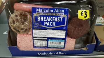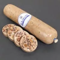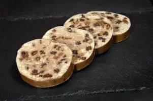 Fruit pudding is a Scottish dish which is a mixture of wheat or oatmeal flour or breadcrumbs, beef suet, brown sugar, currants or sultanas, salt and cinnamon, formed into the shape of a large sausage. Normally cut into slices and fried, it is an optional feature of the traditional Scottish breakfast.