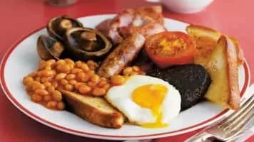 A full breakfast is a substantial cooked breakfast meal often served in the UK and Ireland that typically includes bacon, sausages, eggs, black pudding, baked beans, tomatoes and mushrooms and a beverage such as coffee or tea.
