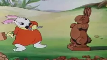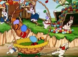 Industrious rabbits take an assembly-line approach to making chocolate goodies and decorating eggs for the Easter holiday.